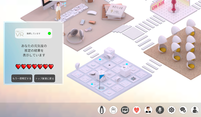 このサービスは、ワーカーの心身のコンディションを可視化するメタバース型オフィスサービスです。ワーカーは筋変位センサをふくらはぎに装着することで、自身の「元気度」や「リラックス度」を推定し、アバターに反映させることができます。