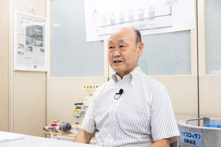 「こちらは『ラダホール』と呼ばれる組み立て式マンホールを活用した製品で、施工が簡単なことが一番の特徴になります。独自の集水形状により、汚物の回収や清掃時間を短縮。防水コンクリートを混入することで耐久性を高めており、災害時でも安心してご使用いただけます」と話すのは、同社顧問の石川隆さん。長年コンクリート業界に身を置き、人々の暮らしを見守ってきたコンクリート技師です。