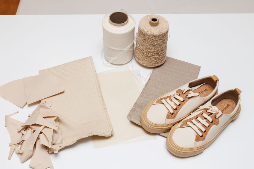 濡れても破れにくい古紙100%の紙糸「カフェテックス」は軽く、壁紙や椅子の座面、バッグなど幅広い製品への展開が可能。さらには、靴のアッパー(生地)にも応用が進んでいます。従来の紙製品では考えられなかったジャンルへの採用を目指し、さまざまな製品への提案を進めています。