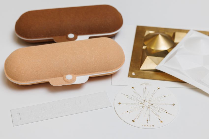 熱プレス成型によって眼鏡ケースなどに応用できるほか、エンボス加工や箔押し加工といった立体的なデザイン加工にも対応。新たな用途への展開が期待されています。